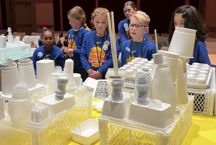 Beesten van plastic afval geïnspireerd door de kunstwerken van Carolien Adriaansche.
