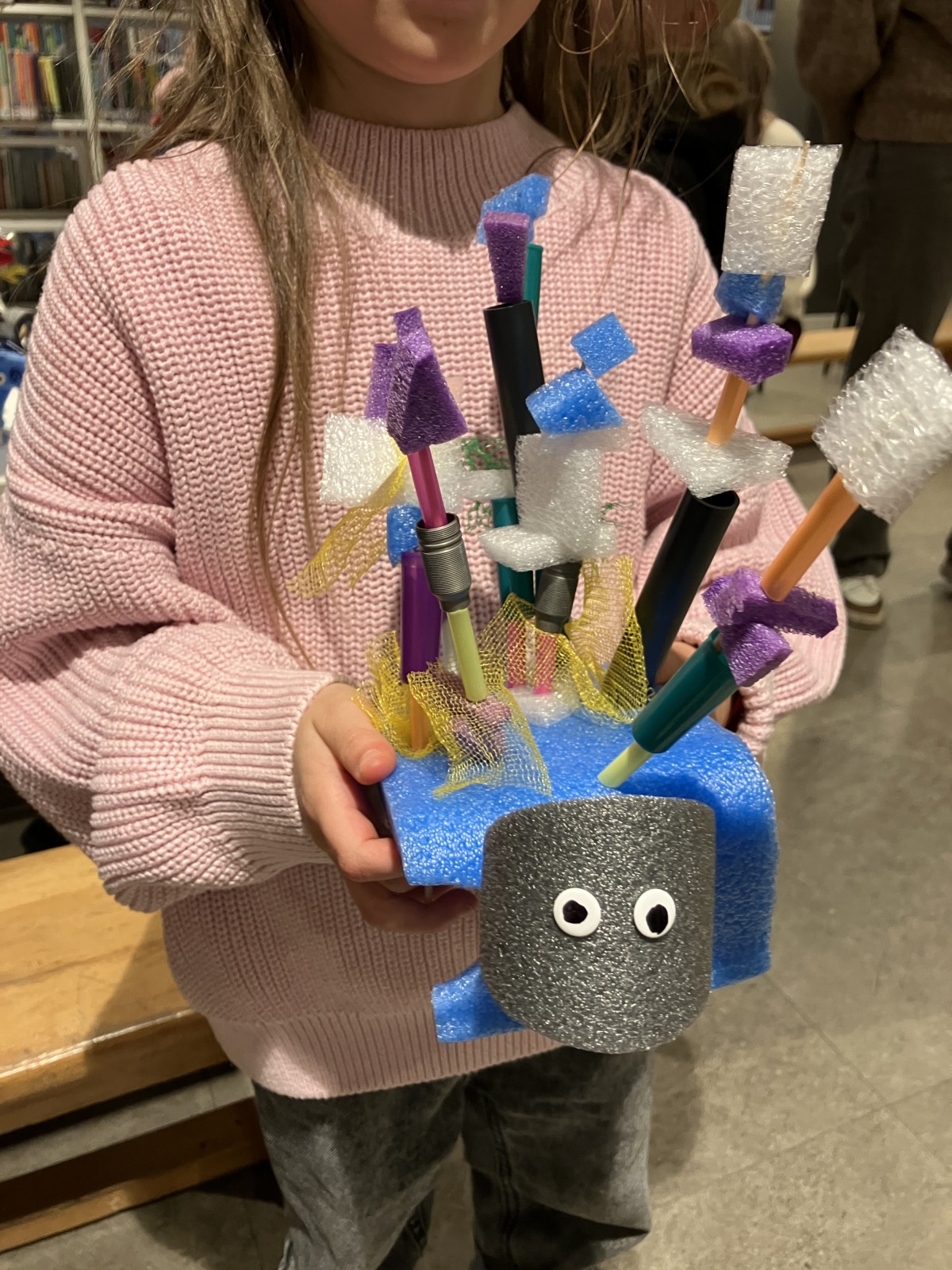 Ik bezocht maar liefst 11 bibliotheken, elk met hun eigen sfeer en publiek. Overal kwamen enthousiaste kinderen en betrokken ouders samen om te knutselen. Wat een fijne manier om de hele stad door te fietsen, met mijn fietstassen vol plastic afval, en zo spelenderwijs aandacht te vragen voor een schonere wereld.