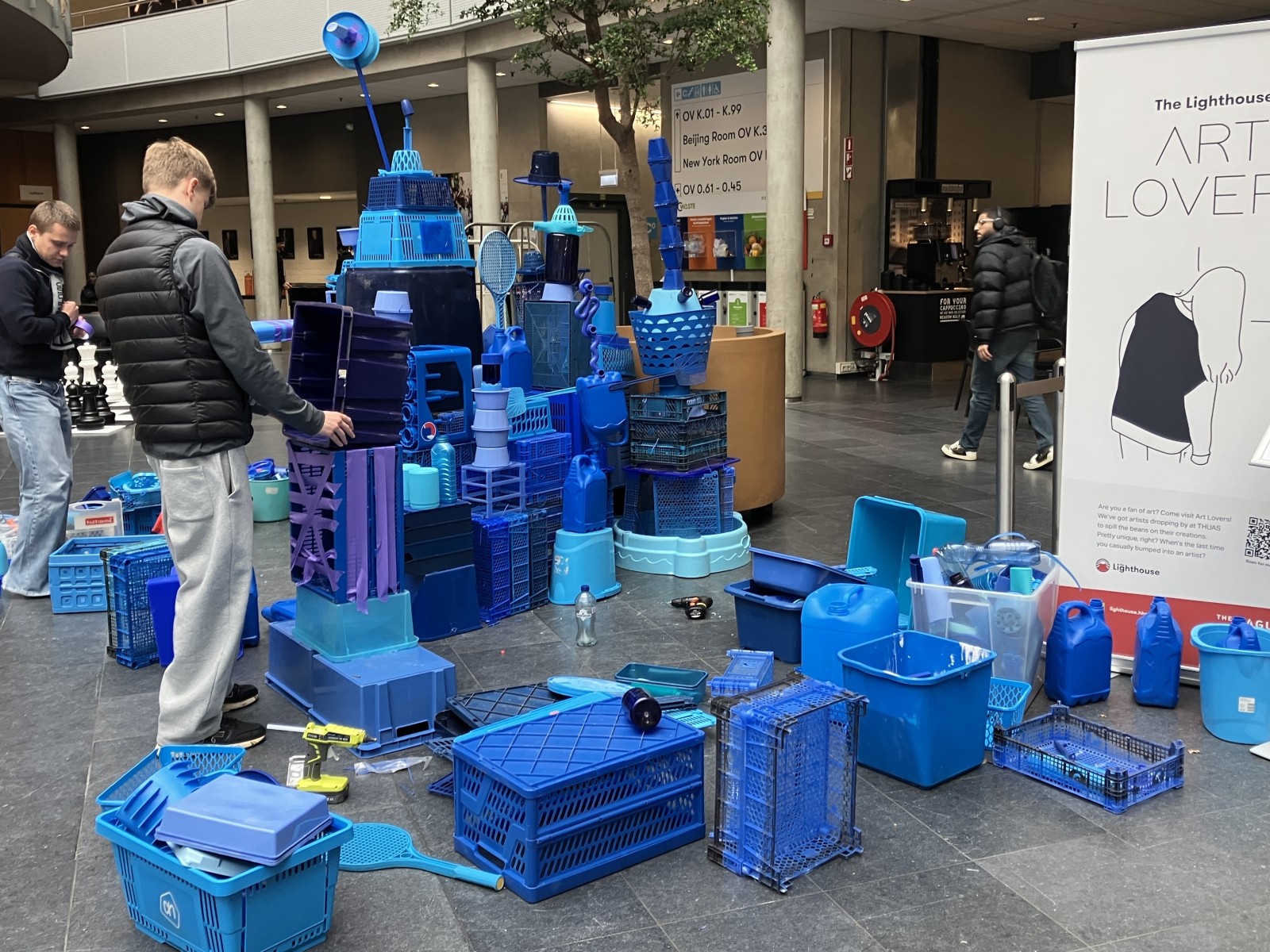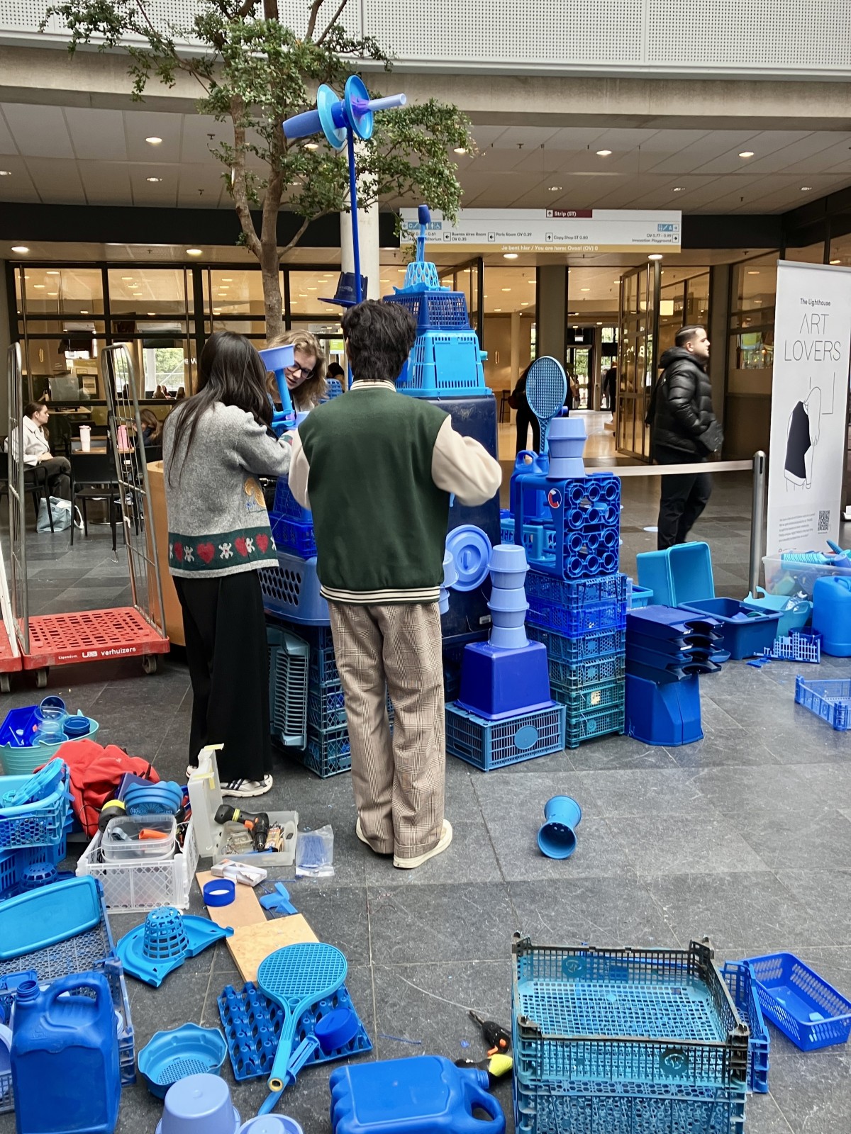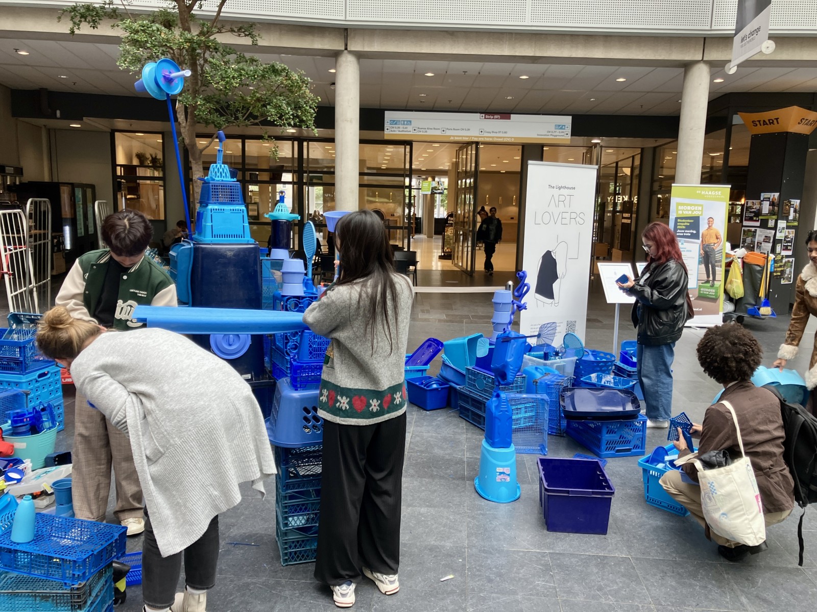 Op uitnodiging van Artlovers bouwde ik samen met studenten aan een kunstwerk gemaakt van blauw plastic afval. In de week voorafgaand aan het evenement verzamelde ik plastic bij de Return Club en HMS op de Binckhorst, aangevuld met materiaal uit mijn eigen atelier.