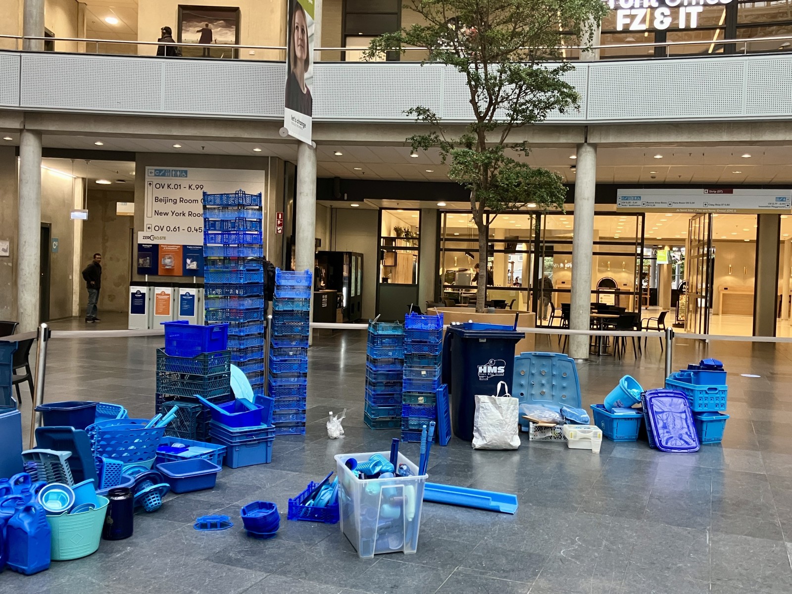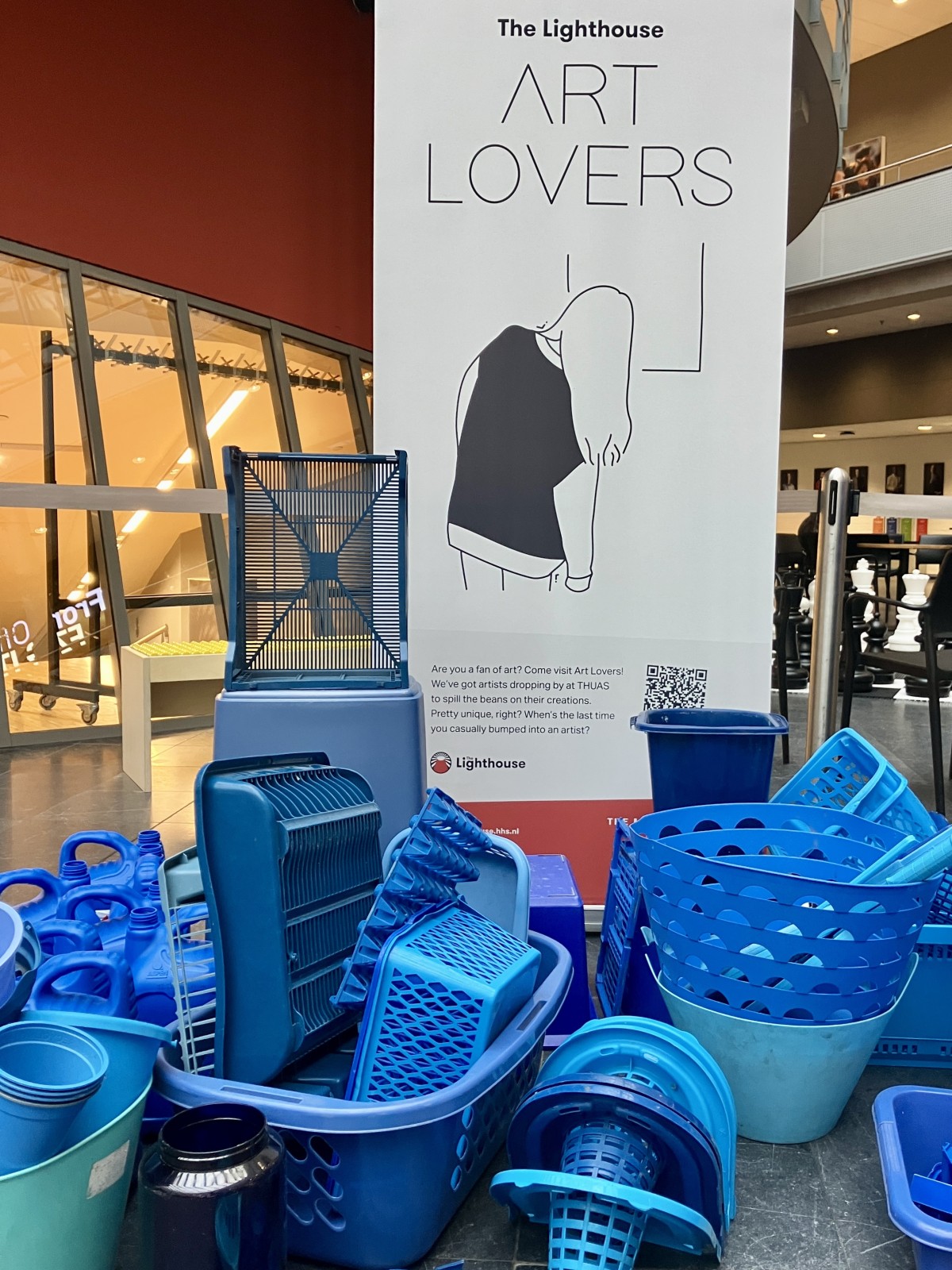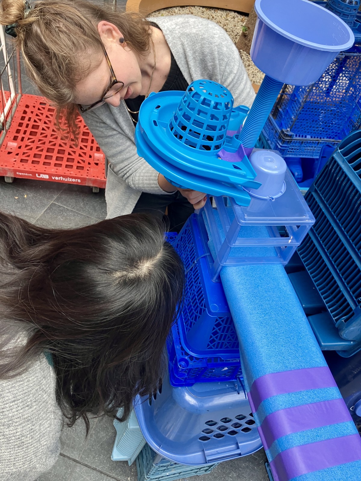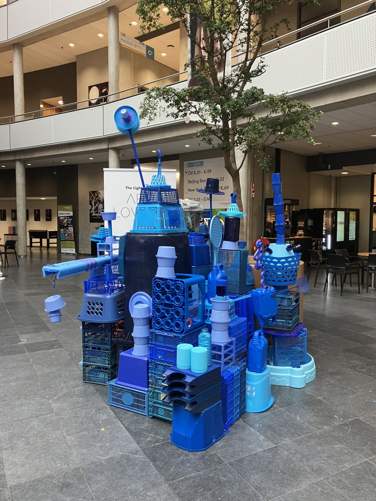 Op uitnodiging van Artlovers bouwde ik samen met studenten aan een kunstwerk gemaakt van blauw plastic afval. In de week voorafgaand aan het evenement verzamelde ik plastic bij de Return Club en HMS op de Binckhorst, aangevuld met materiaal uit mijn eigen atelier.