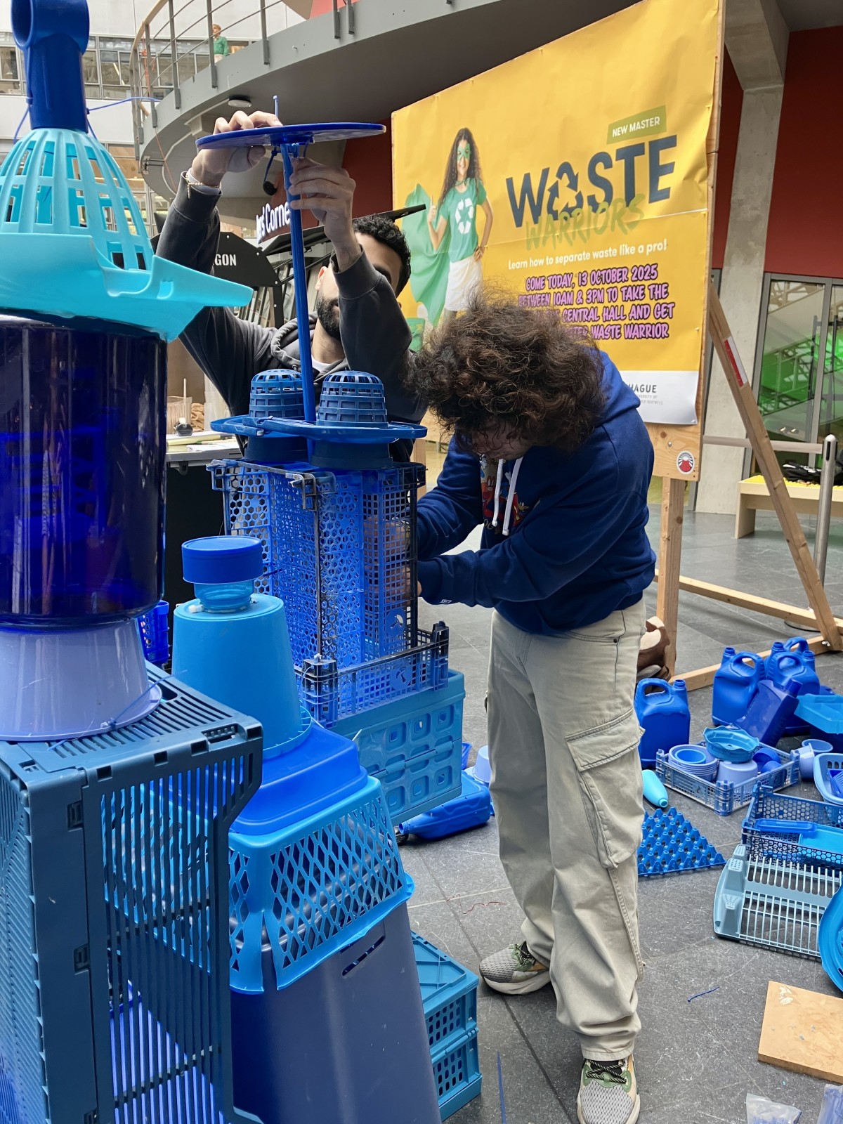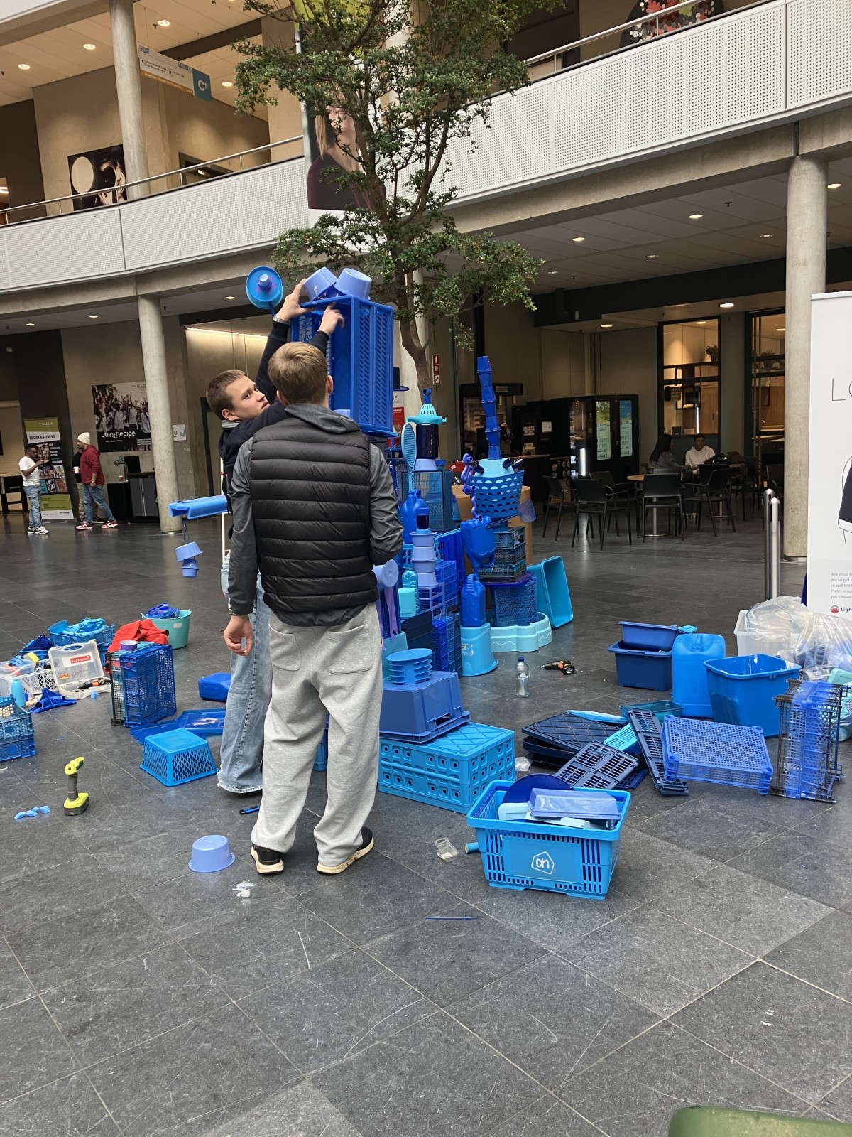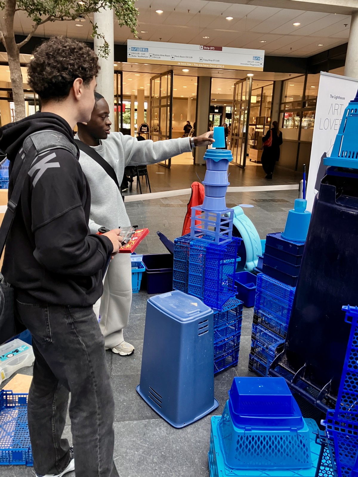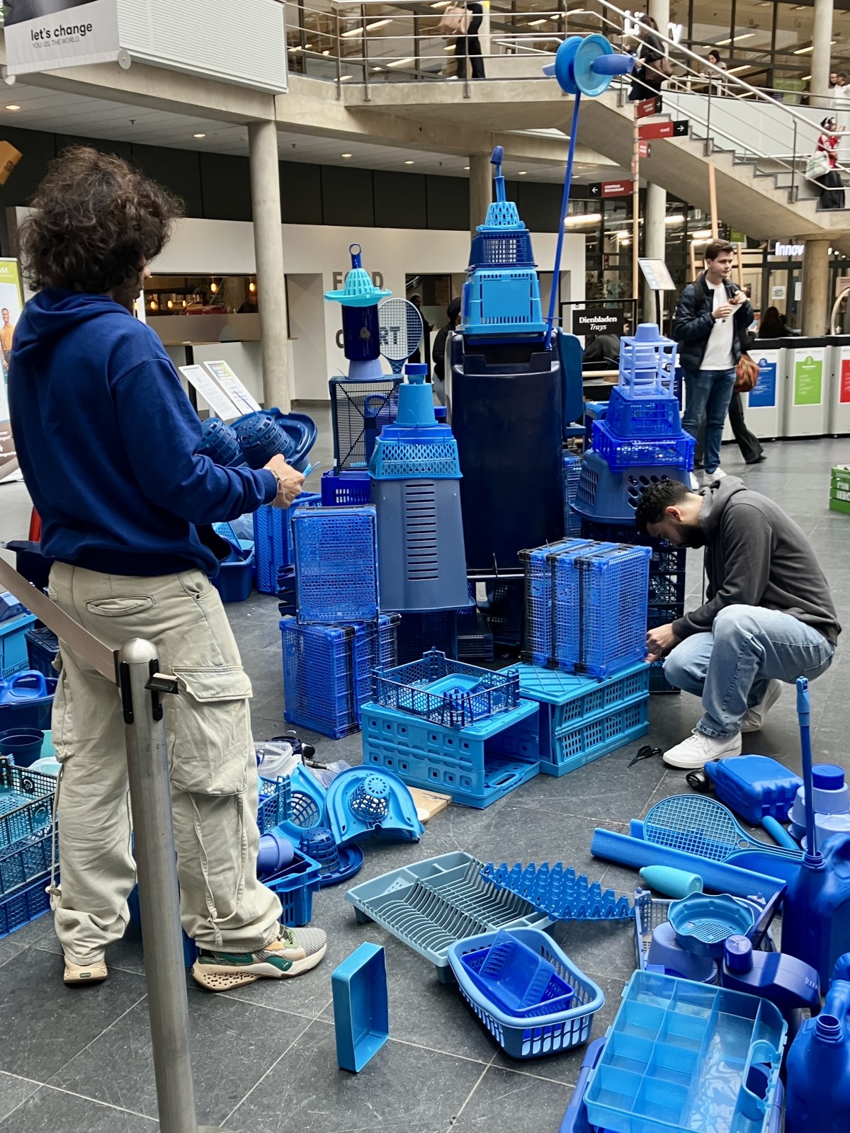 Wat dit project bijzonder maakte, was dat iedereen kon meedoen. Passerende studenten en medewerkers sprak ik aan om zelf mee te bouwen aan de kleine blauwe stad. Zo droegen ze letterlijk bij aan een groeiend, duurzaam kunstwerk.