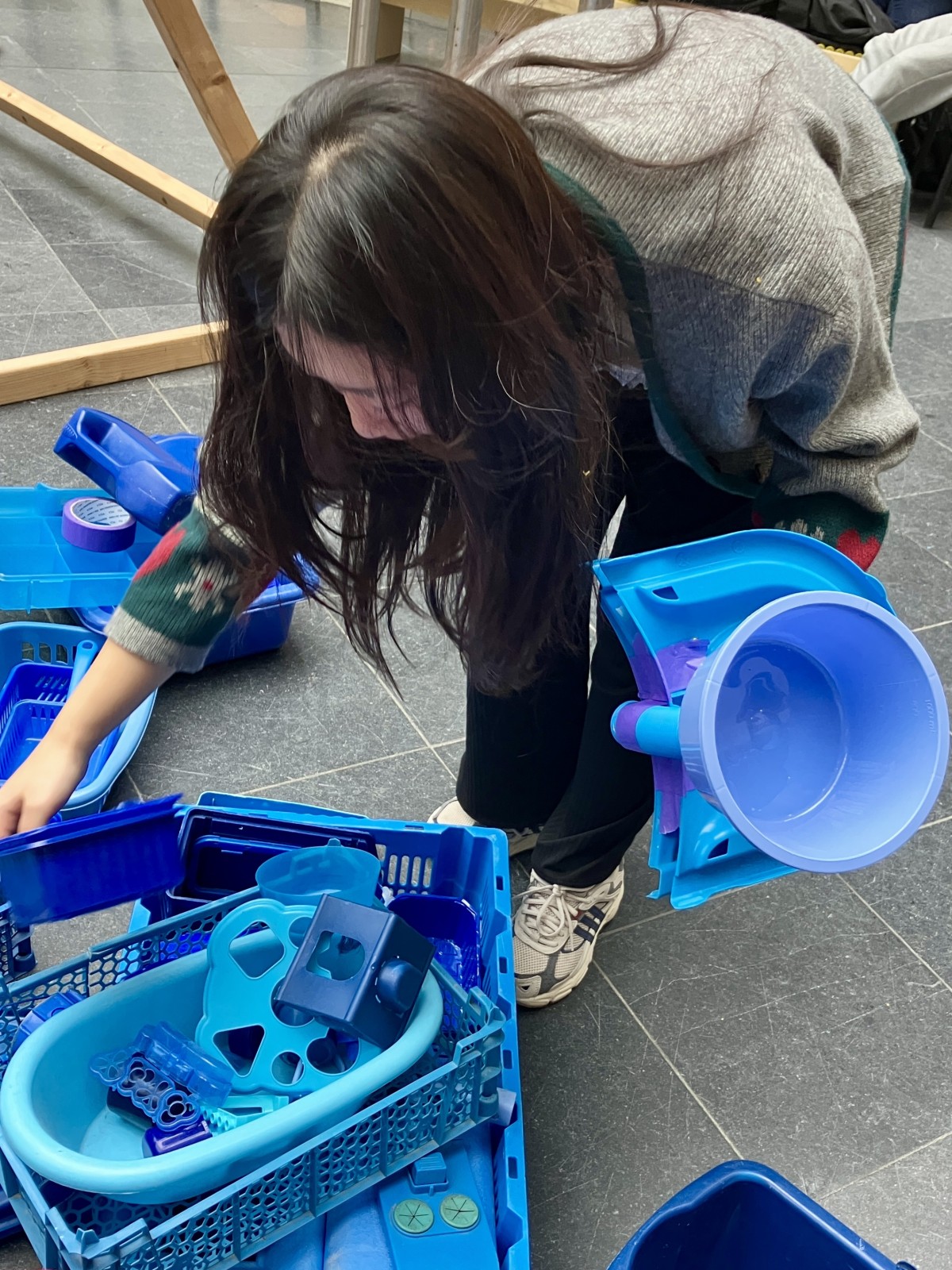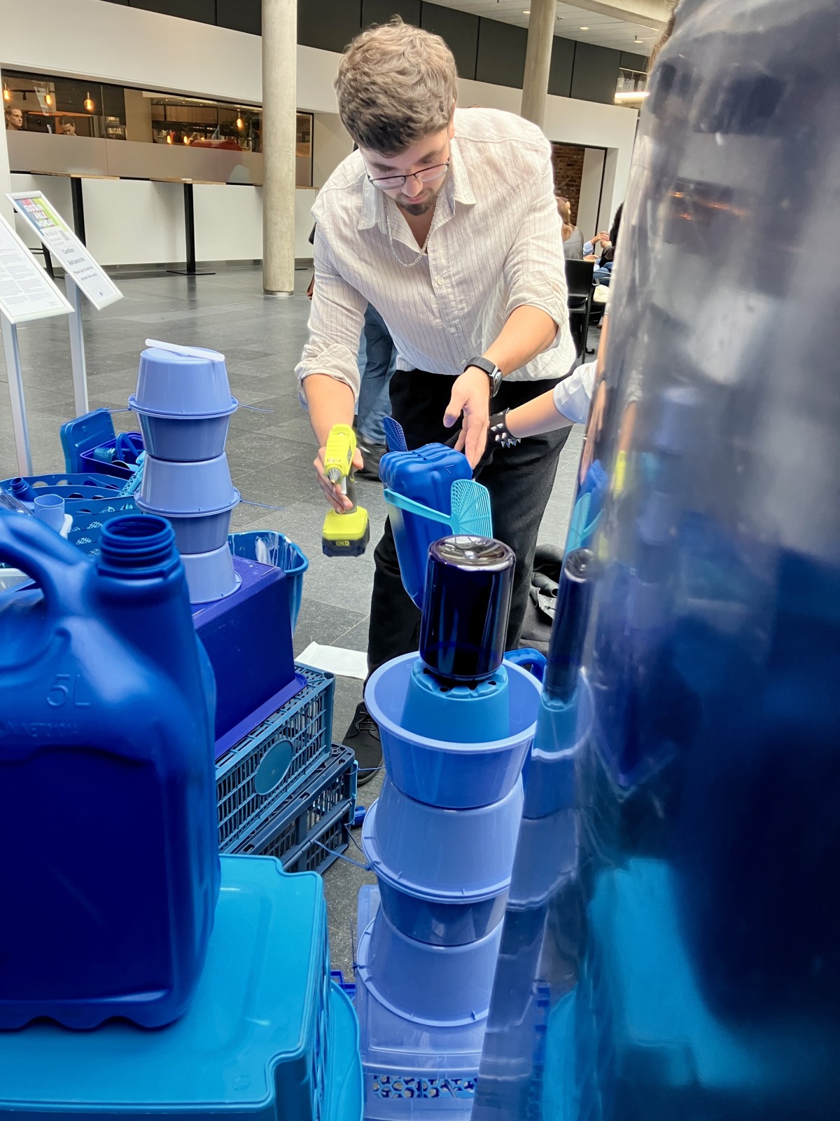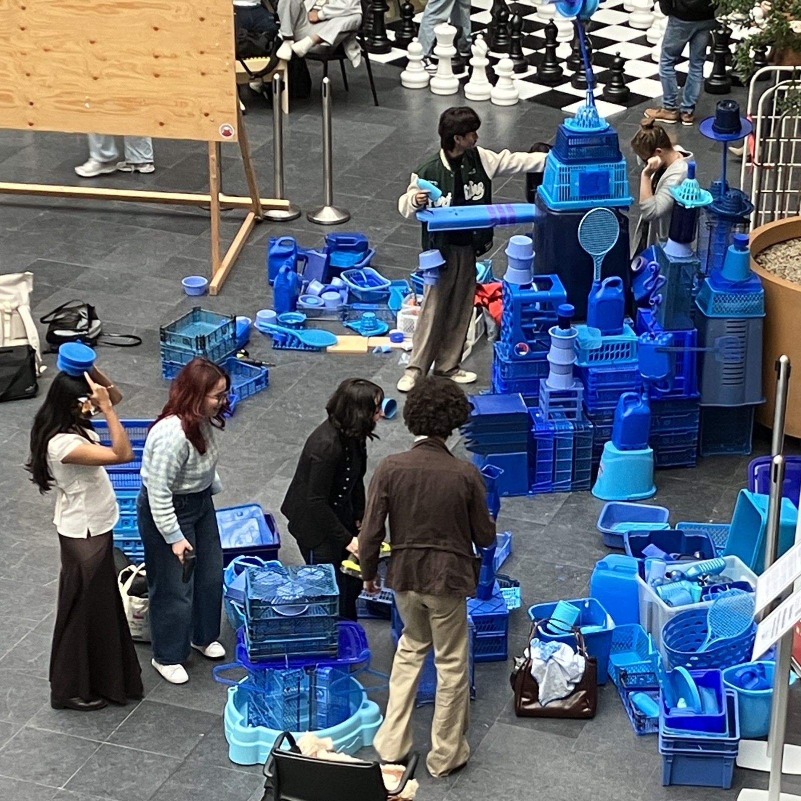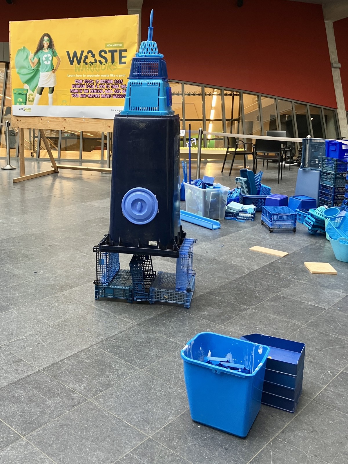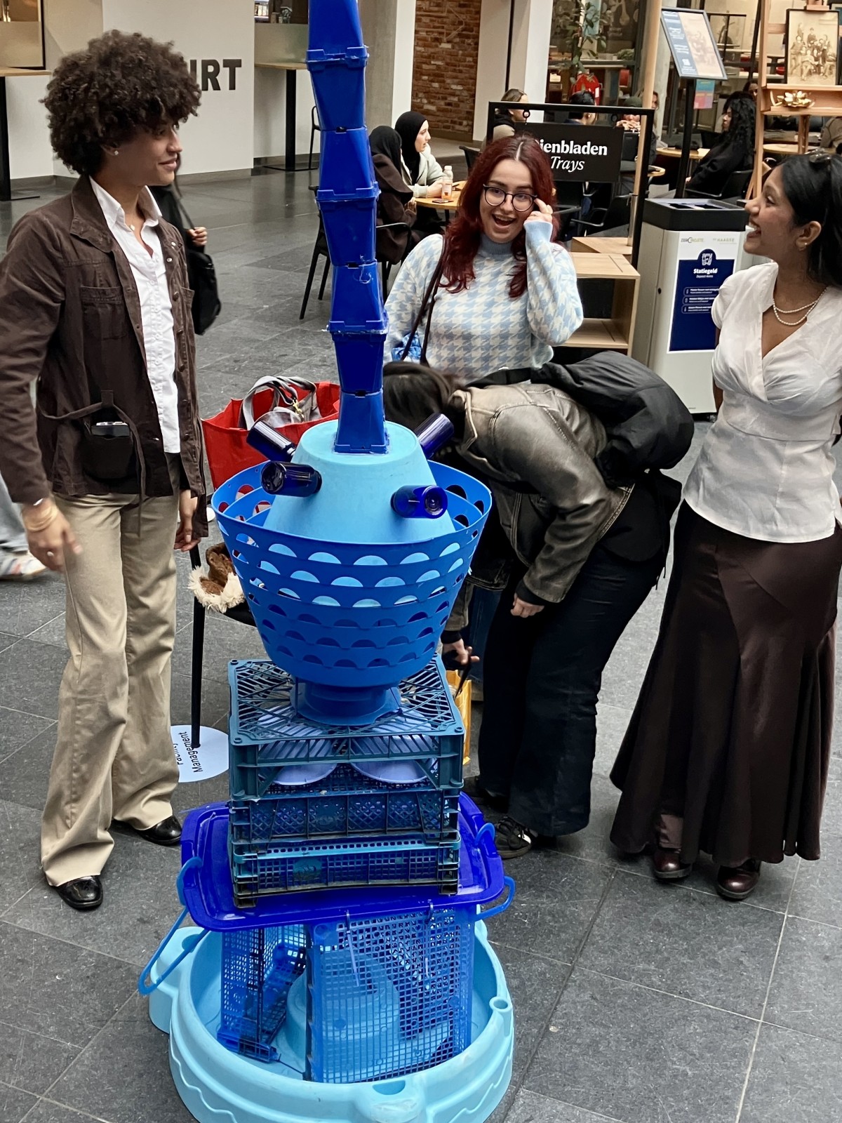 Wat dit project bijzonder maakte, was dat iedereen kon meedoen. Passerende studenten en medewerkers sprak ik aan om zelf mee te bouwen aan de kleine blauwe stad. Zo droegen ze letterlijk bij aan een groeiend, duurzaam kunstwerk.