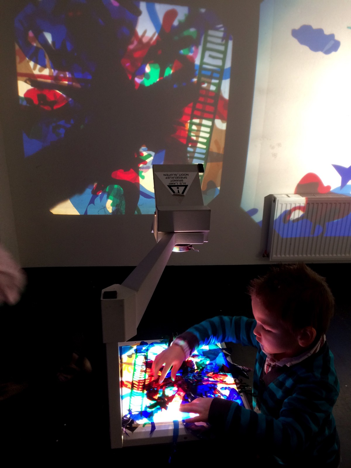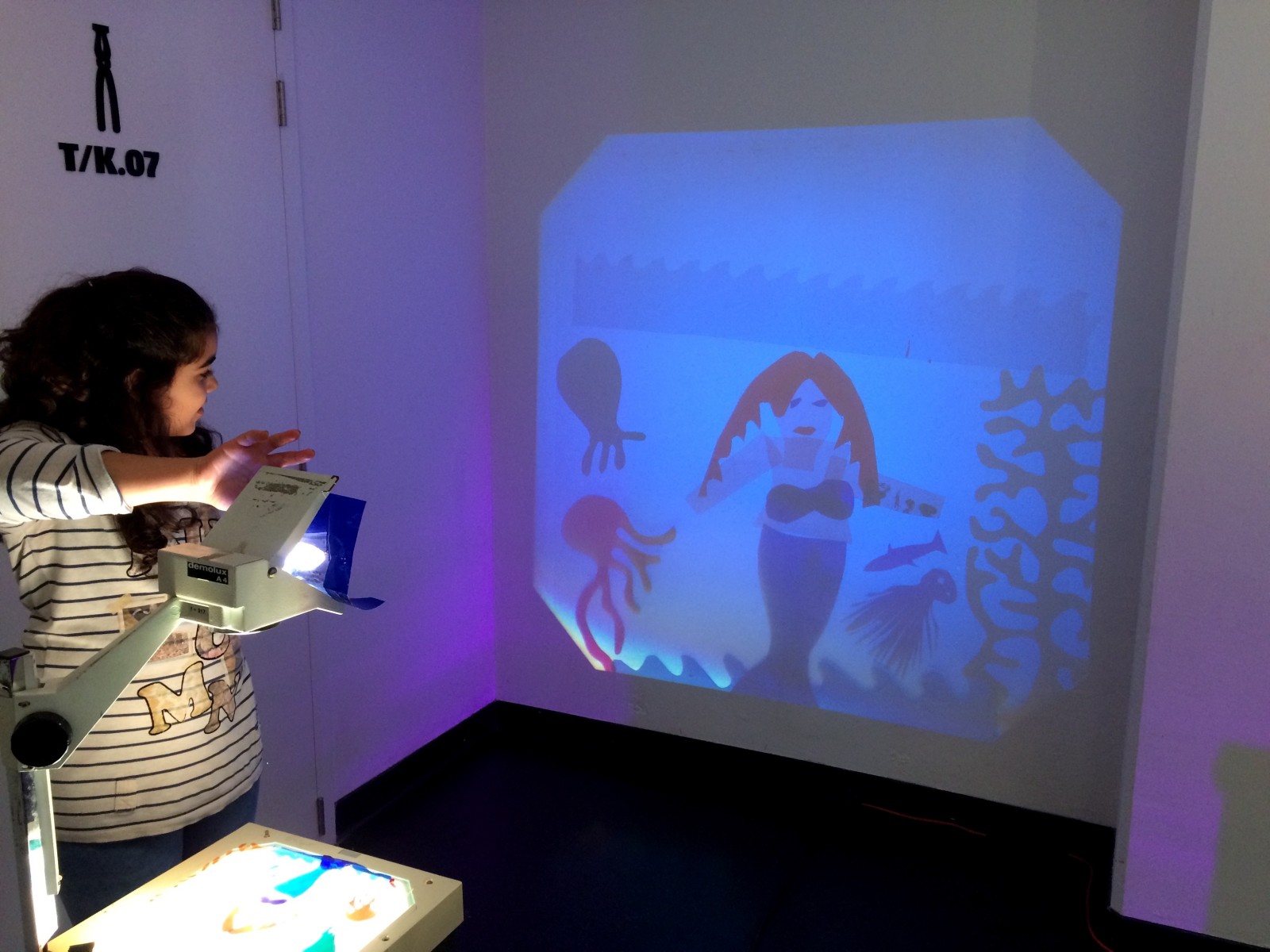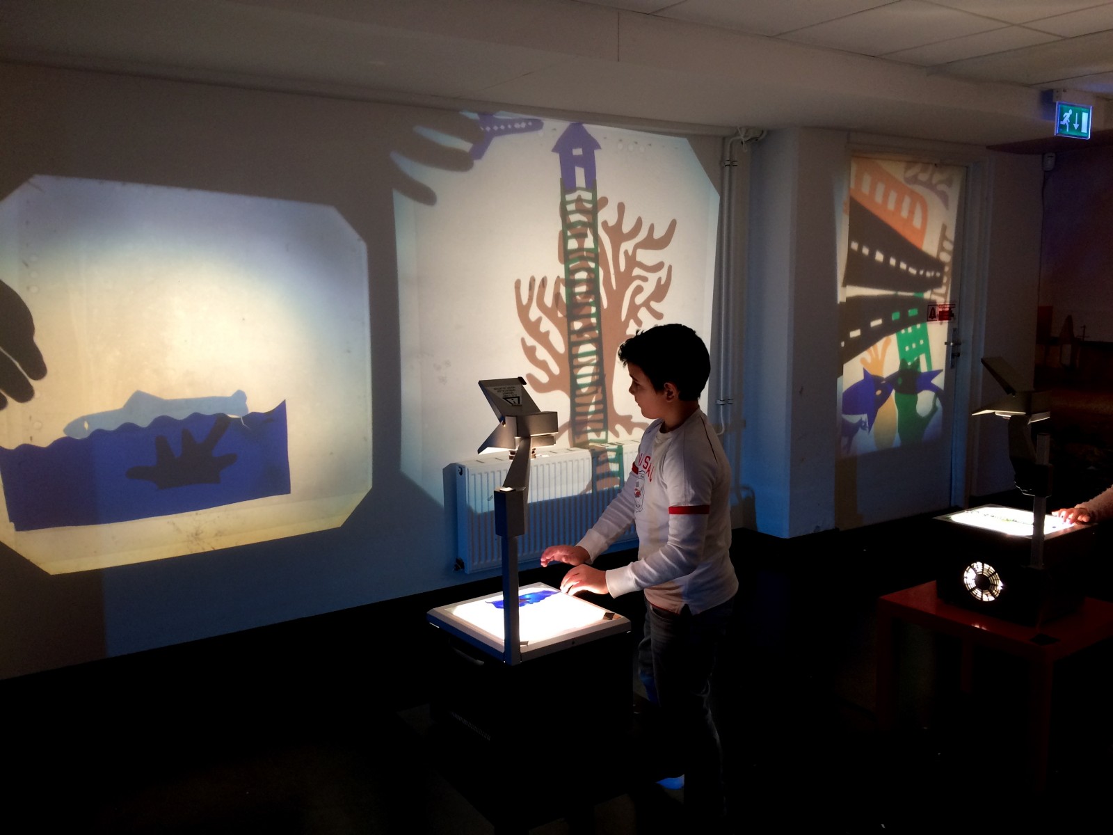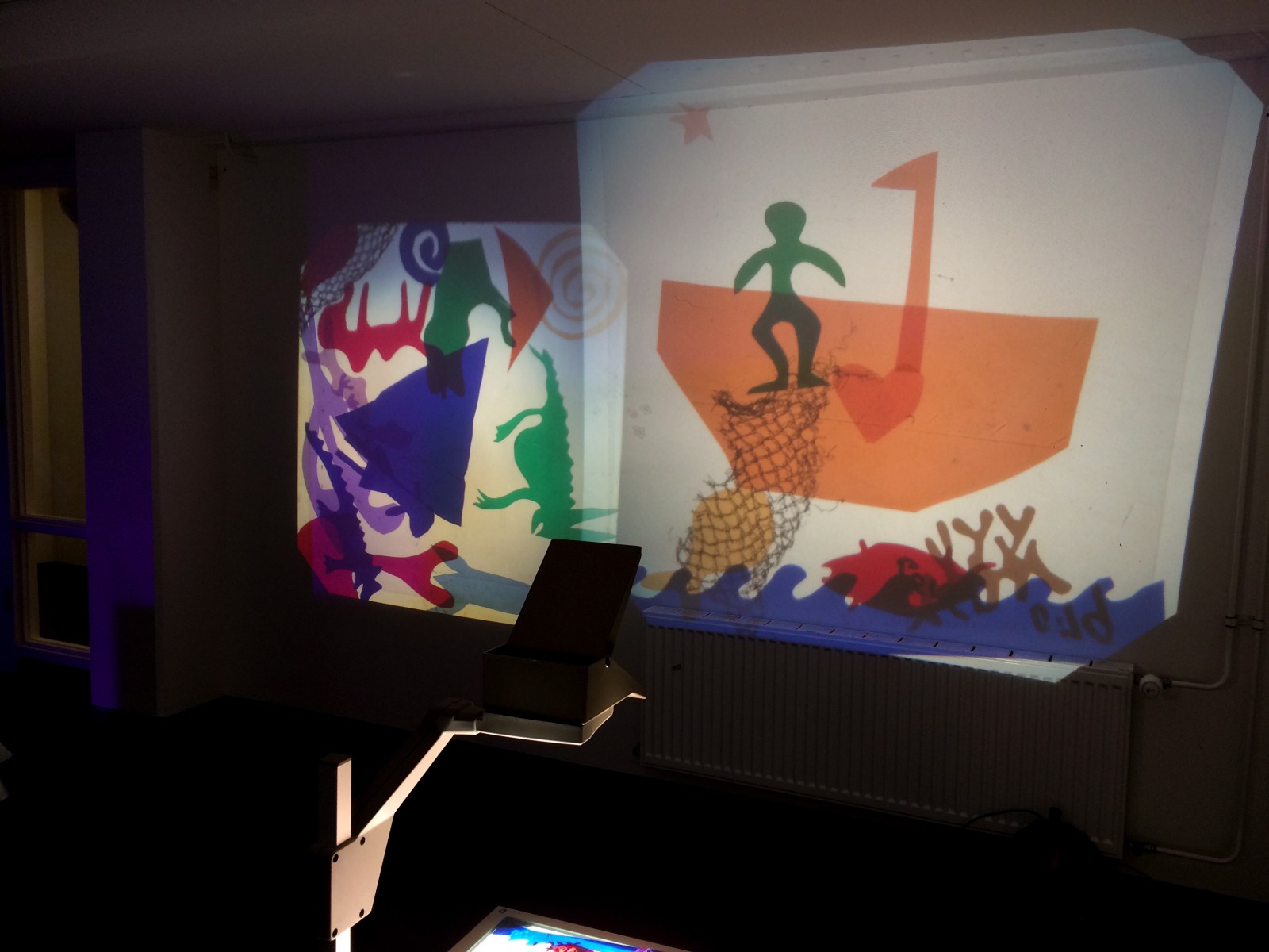 Op 28, 29 en 30 december bracht ik een aantal oude overheadprojectoren mee naar Theater Dakota voor een bijzondere workshop. De theatertechnicus had oude filters van de lampen bewaard, en die gebruikten we als materiaal om verhalen mee te vertellen.
