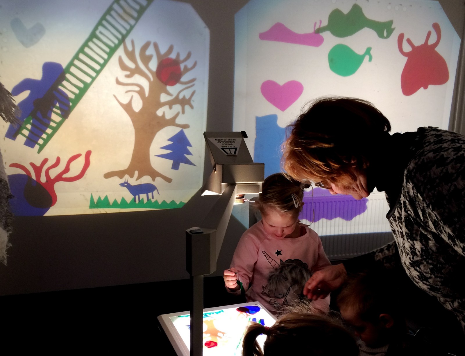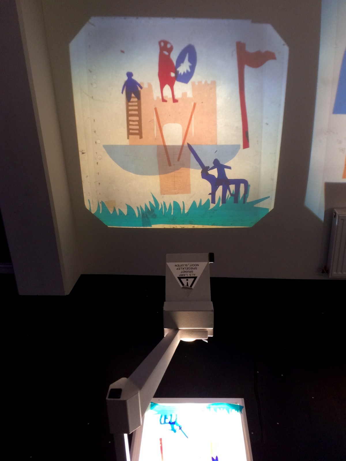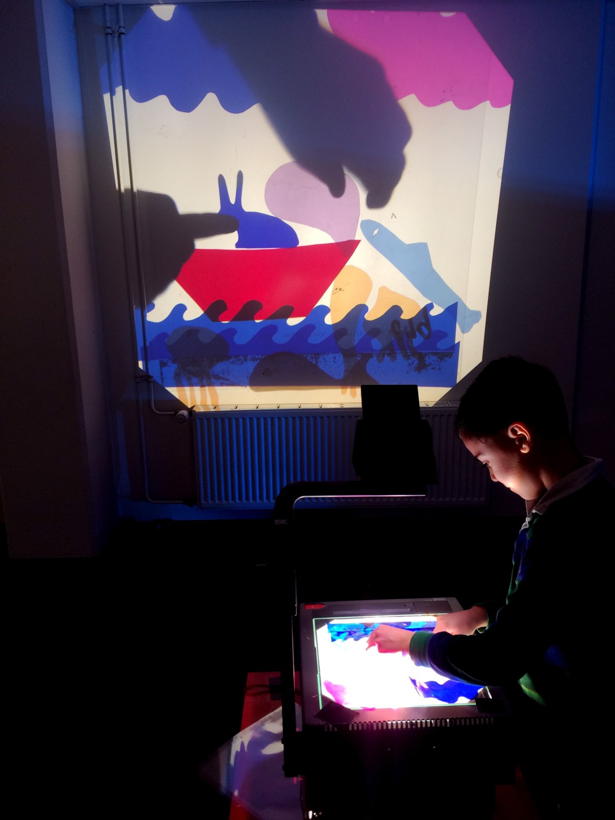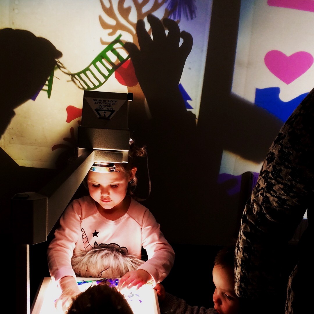 Op 28, 29 en 30 december bracht ik een aantal oude overheadprojectoren mee naar Theater Dakota voor een bijzondere workshop. De theatertechnicus had oude filters van de lampen bewaard, en die gebruikten we als materiaal om verhalen mee te vertellen.